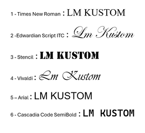 1 - Times New Roman, 2 - Edwardian Script ITC, 3 - Stencil, 4 - Vivaldi, 5 – Arial, 6 - Cascadia Code SemiBold |