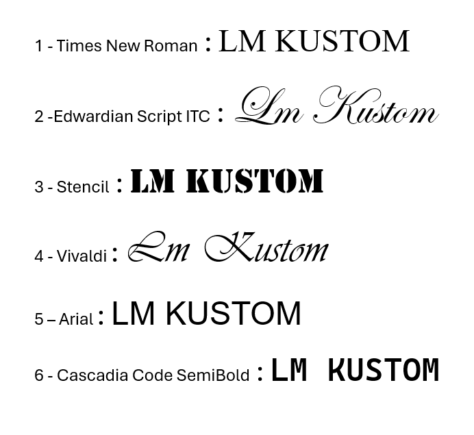 1 - Times New Roman, 2 - Edwardian Script ITC, 3 - Stencil, 4 - Vivaldi, 5 – Arial, 6 - Cascadia Code SemiBold |